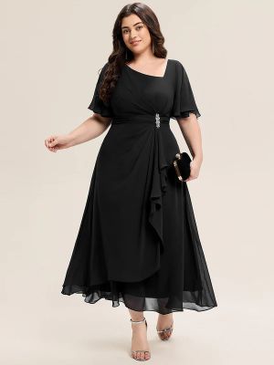Midi crna haljina sa kratkim rukavima i brošem.